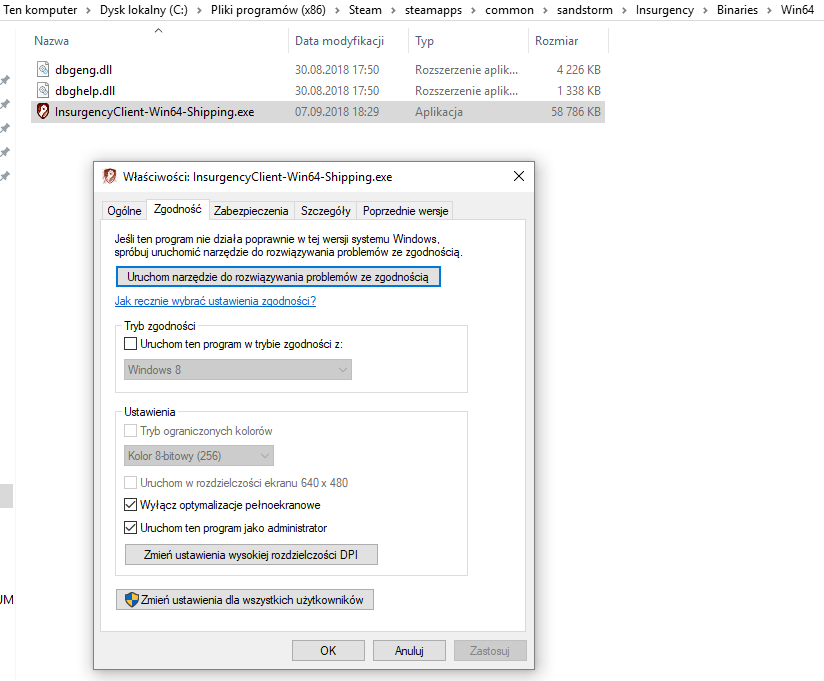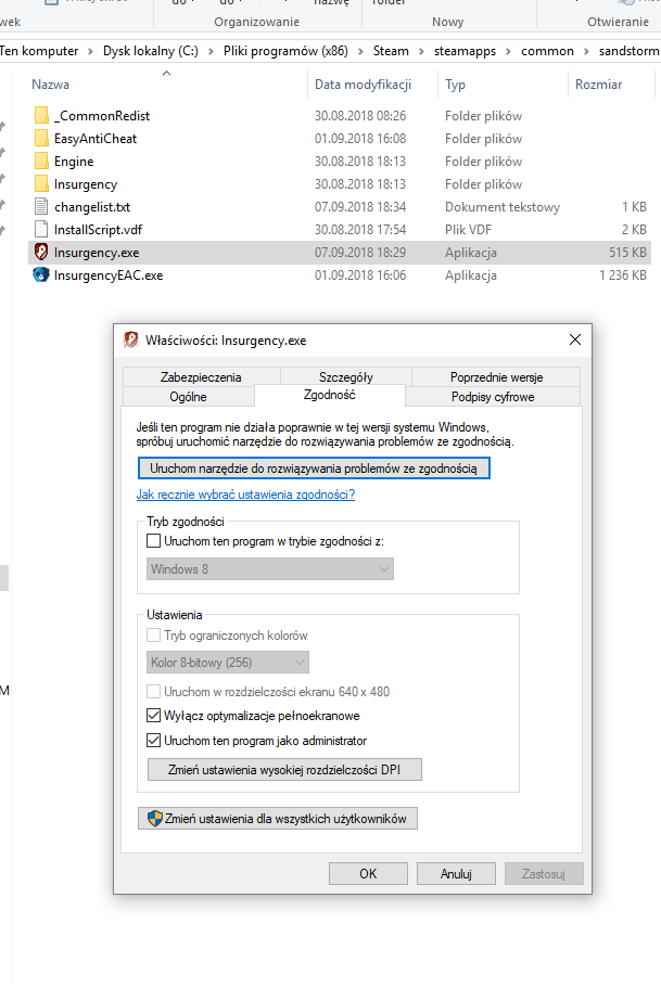 Dokonaj następujących zmian zgodności plików insurgency.exe oraz Insurgencyclient-win64-shipping.exe