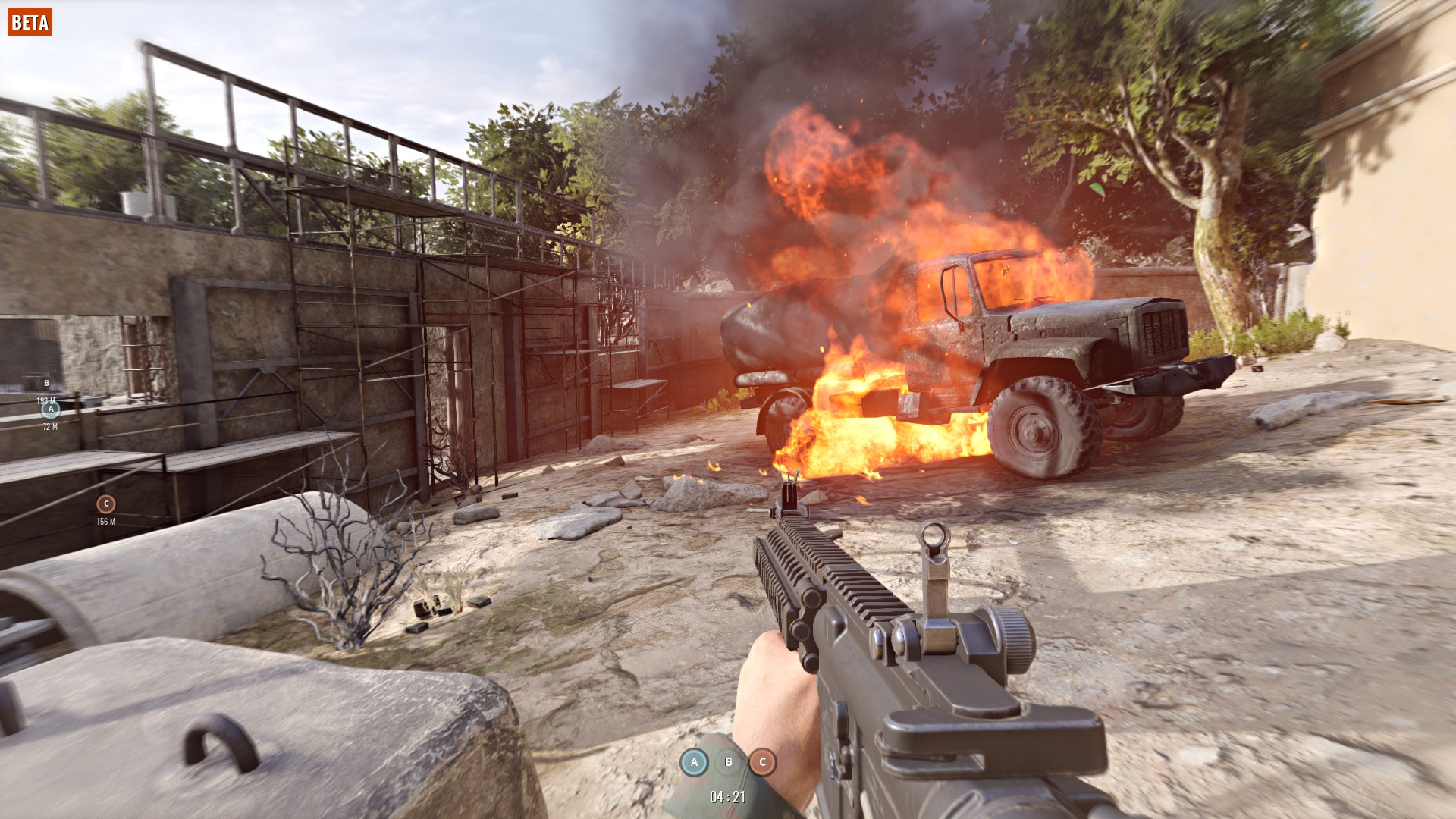 Zasady trybu turniejowego są opisane w dziale 4 “Tryby gry” dodam jedynie że jest on łudząco podobny do “Unranked Compete” ze starego Insurgency. Mamy 3 punkty kontrolne A,B,C. Każda z drużyn ma na starcie po jednym skarajnym (A lub C), rozpoznasz go po kolorze niebieskim. Punkt czerwony zawsze należy do wroga, punkt szarobiały jest neutralny. Runda kończy się wygraną gdy na koniec czasu Twoja drużyna będzie mieć 2 przejęte punkty lub cały team wroga zostanie unieszkodliwiony.